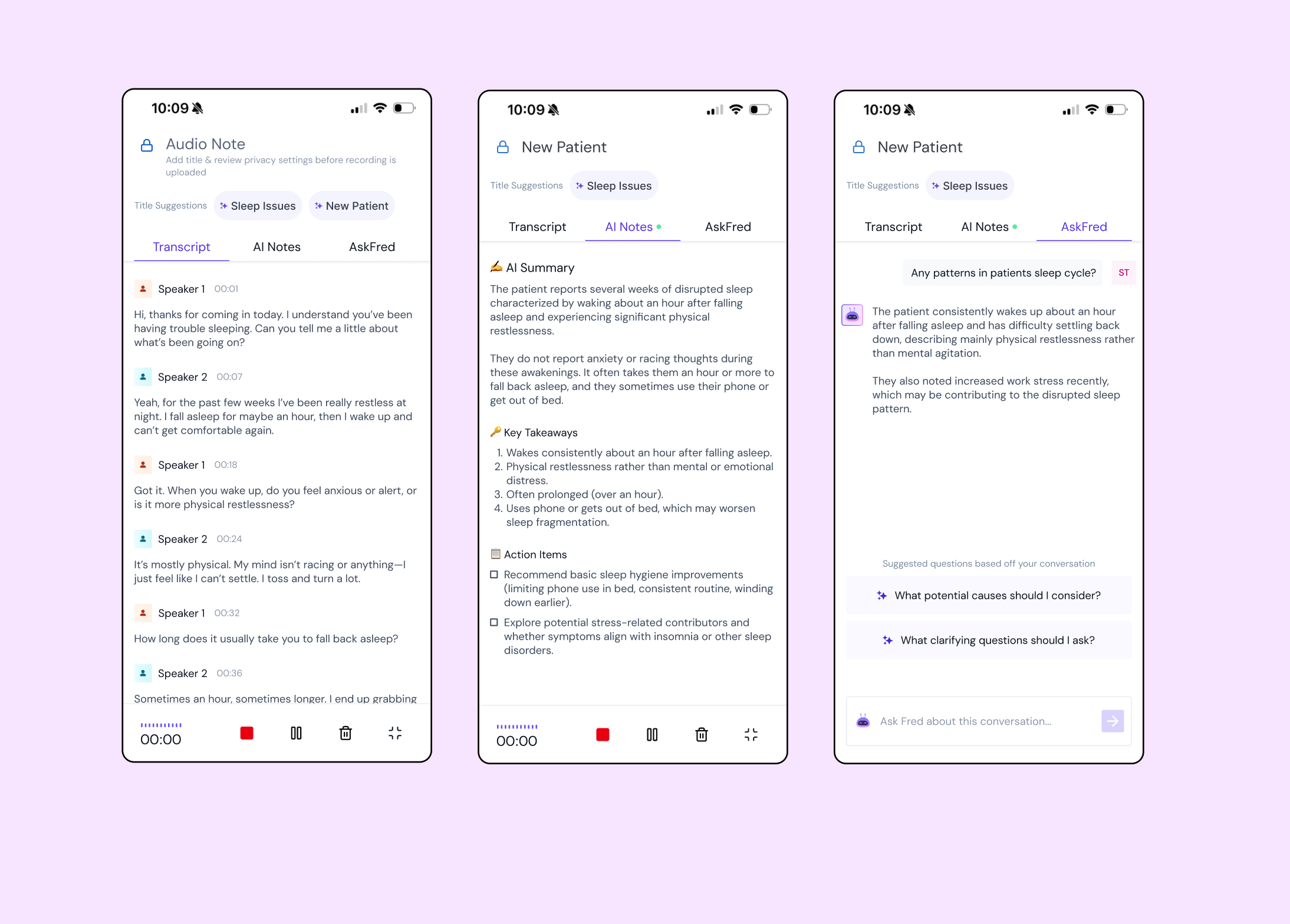 I designed a new mobile workflow that lets users record conversations, view live transcription and AI-generated notes in real time, and interact with Fireflies’ AI assistant (AskFred)