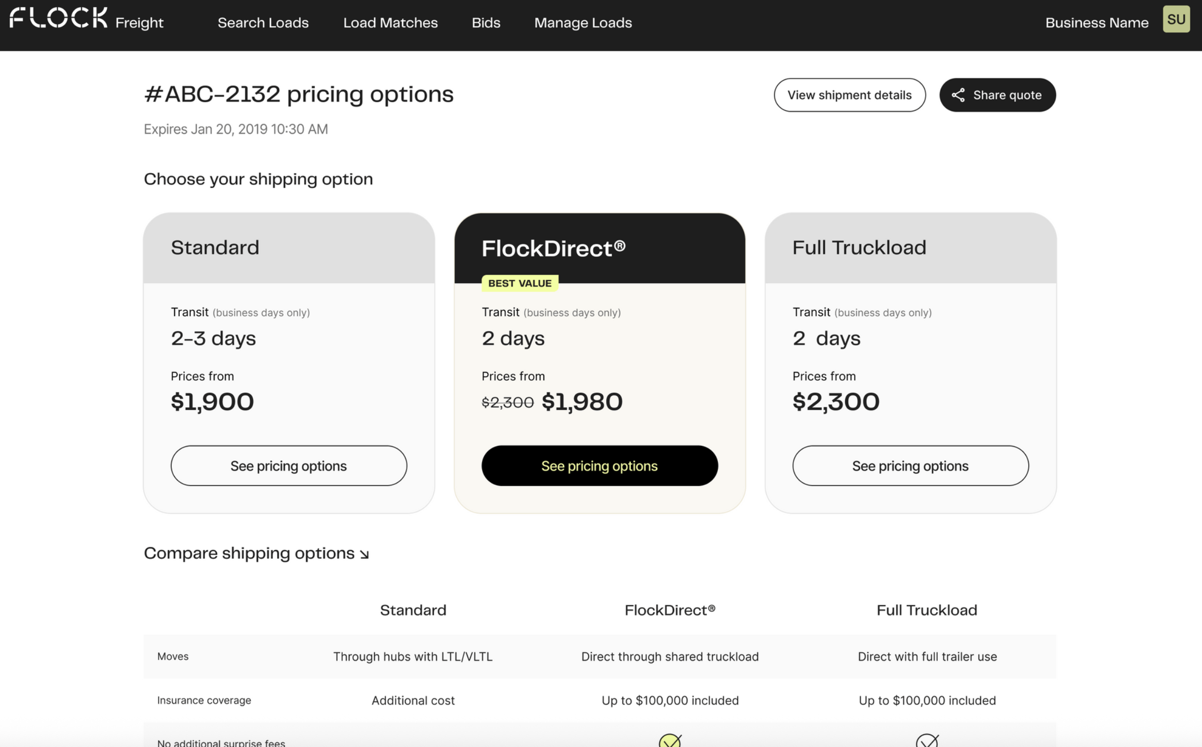 During a 3-day hackathon, we visualized CO₂ savings directly in the app to encourage adoption of FlockDirect, our most sustainable shipping option — increasing win rates and reducing empty miles.